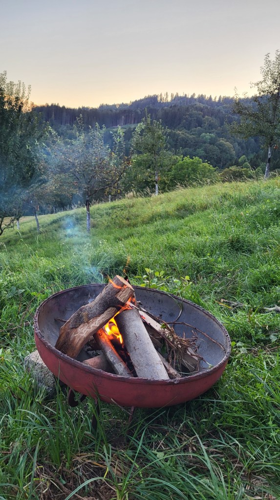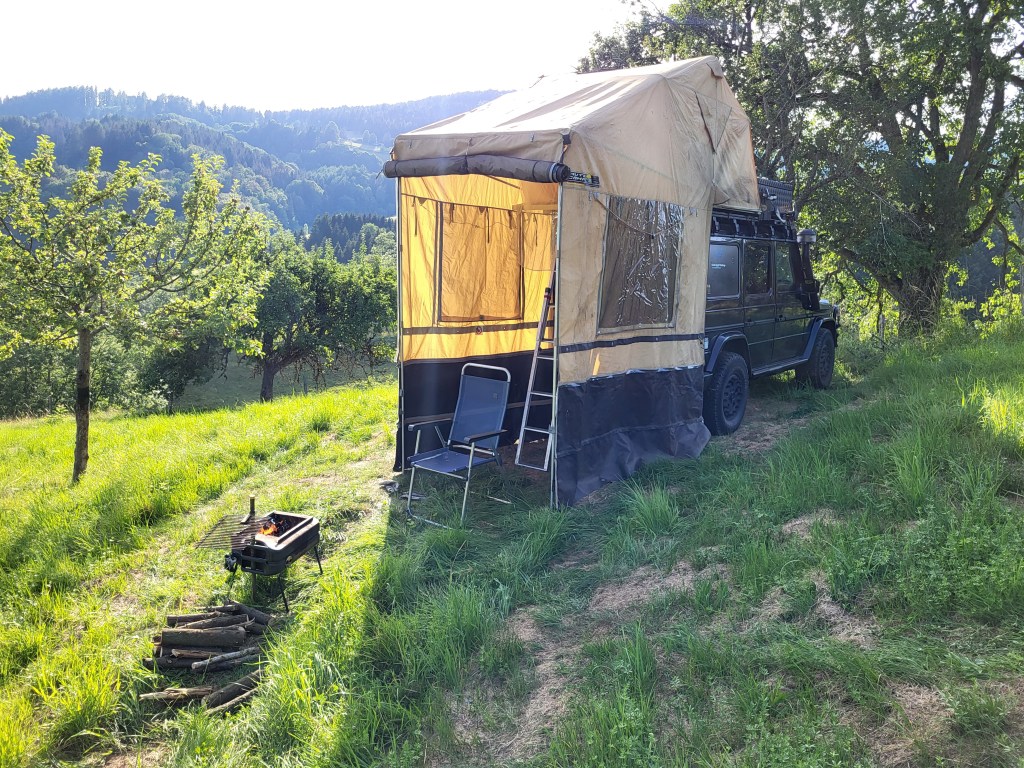 Auf unserer Streuobstwiese am Hang können 1-2 Overlandtrucks parken, unsere Outdoorküche und -dusche stehen den Weltreisenden gerne zur Verfügung. Achtung 4×4 Antrieb ist von Vorteil, bei feuchter Witterung kann das Fortkommen schwierig bis unmöglich sein. Unbedingt vorher Kontakt mit uns aufnehmen.